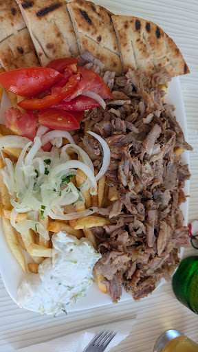 Having seen good reviews, we chose this place for our first gyros on our holiday. We ordered the pork gyros portion each, with a generous amount of tsatziki (having skipped breakfast and lunch). We got our beers promptly, and, a short time later, we got our food. Initially, it looked amazing, with the exception of the disproportionately small amount of tsatziki. We then found that when we delved into the gyros, there was just a covering of it over the fries, as well as half the plate solely being fries. The ratio must have been 70% fries to gyros. The tsatziki was soon depleted, necessitating extra being ordered. The €3 portion that I received, after a wait of more than 10 minutes, was around 4 times more that the original amount on our plates.