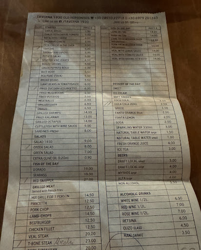 My wife and read the last few reviews and decided to give 1930 a try instead of the busier tavernas a few metres away. We followed the owners recommendation and found the starters to be very tasty although the calamari was plentiful there was no refreshing lemon and garlic mayonnaise you find in other tavernas, . The stuffed vine leaves made by grandma were delicious. Unfortunately the main meals were not so good. The lamb was very overcooked and inedible, we actually gave most of it to the cats in the garden where we sat (with the owners permission), My wife did not want me to complain although of course the owner asked and i did explain it was in our opinion not good. My veal in tomato sauce was slightly better and i managed to eat most of it but still the cats had some. The fried potatoes were very nice and light. The local wine.. we each had a carafe of red and white, unfortunately the quality was not so high we could only drink half a glass each and left the rest. We were given some nice fresh melon at the end of the meal free of charge. We really enjoyed the local friendly atmosphere, but unfortunately the food for us was not of the same quality. We wish the family good luck...