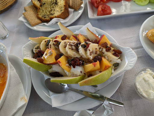 Frühstück: Bei dem Frühstück wird auf bekanntes und bewährtes gesetzt (Toast, Käse, Wurst, Sesamstangen, Erdbeermarmelade, Honig, Butter, hart gekochte Eier). Hinzu kommt jedoch, dass ebenfalls heimische Speisen serviert werden, die frisch zubereitet werden (griechischer Joghurt mit Honig, Banane, (Birne/Apfel/Nekatrinen) - variiert, garniert mit selbst angebauten Früchten) sowie hausgemachter Kuchen. Meine Frau (Halbgriechin) fragte Maria, in welcher nahegelegenen Lokalität man denn gute Bougatsa finden kann (griechisches Gebäck aus Filoteig, Variante: als Süßspeise mit Creme oder Grießpudding). Nicht nur half uns Maria mit Rat und Tat, sondern bewies ihre außergewöhnliche Gastfreundschaft mit einer Bougatsa am darauffolgenden Tag. Wir waren beide sprachlos, von solch einer Aufmerksamkeit und Freundlichkeit. Vielleicht mag das Frühstück nicht nach jedermanns Geschmack sein, mir und meiner Frau hat das Frühstück aber ausgezeichnet geschmeckt.