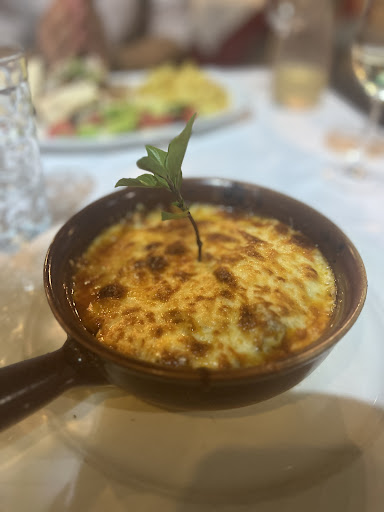 The food was delicious: traditional Greek dishes with a subtle hint of Italian influence. We started with pita bread and, on the ownerโs recommendation, garlic bread with homemade tzatziki โ both excellent. We also had vine leaves and melon with prosciutto, which were very tasty.