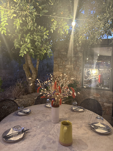 Atmosphere: secluded in a picturesque little village howling with jackals. Light wind through the olive groves and darkness made the drive through even more palpable. The place itself... fully lit from bulb-garlande and soft greek music playing in the background. Marble square tables and beautiful vase flowers welcomed us.