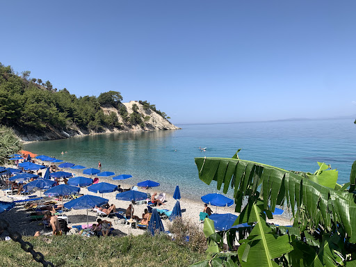 I wasn't that much fascinated about this beach. There are two small taverns, but service is terrible. We've waited more than half hour to be served, and we got our order after waiting almost 45 minutes. I ordered calamari and I hoped that would be fresh, but instead I got frozen and I payed it about 10 euros for just two small calamari. There are to many people on the beach and you also have to pay for sunbeds and umbrellas. I wouldn't come back to this place. Sea is clean and that is only thing...