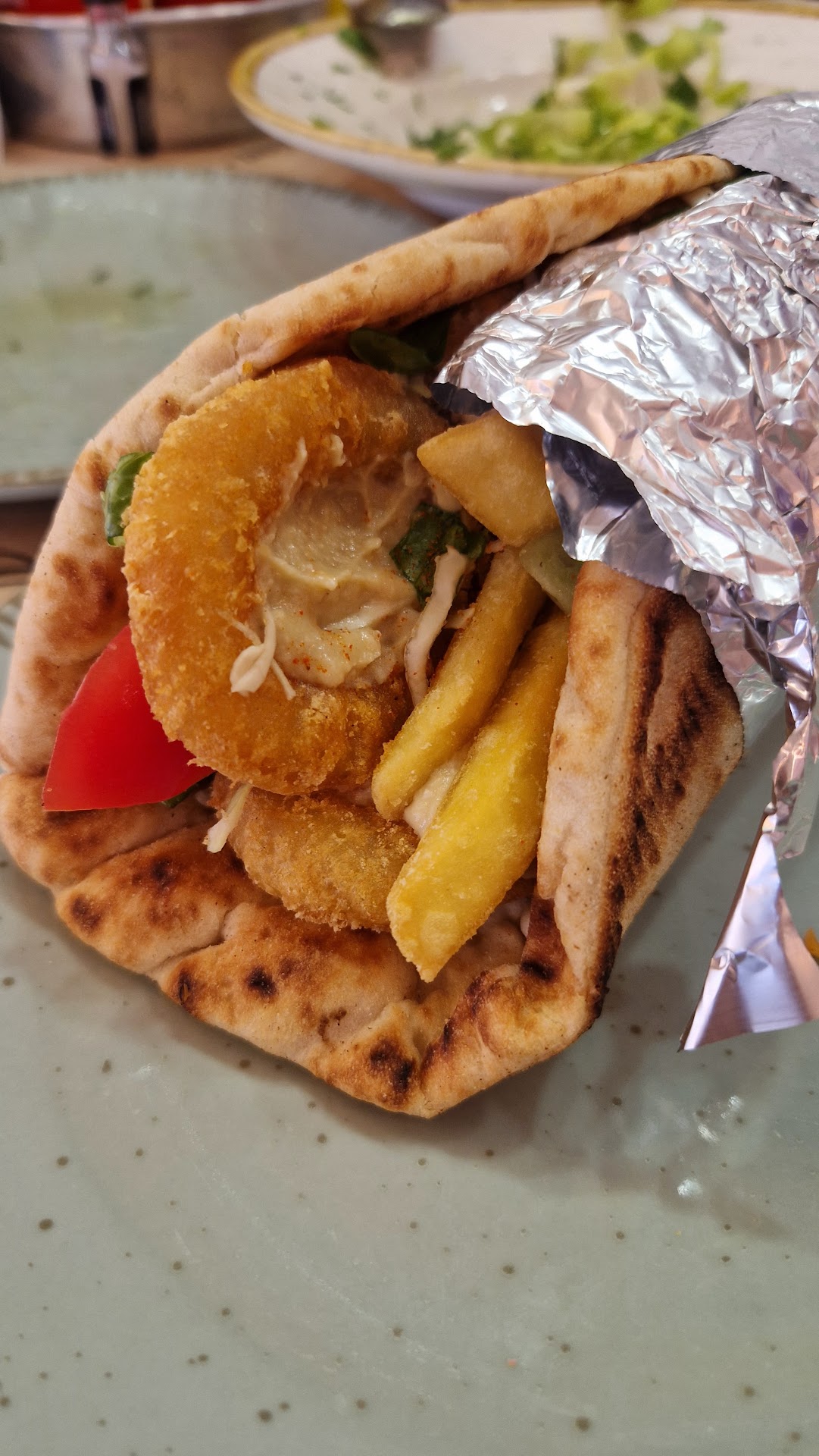 Με έφερε η κοπέλα μου γιατί είναι γνωστό μαγαζί... Πήραμε μια σαλάτα μαρούλι.. Μια πίτα με καλαμάκι κοτόπουλο και εγώ δεν τρώω κρέας πήρα μια μεγάλη πίτα όπως την λέει στο κατάλογο με καλαμάρι!.. Η πίτα της κοπέλας μου ήταν καλή.. Η σαλάτα ήταν πολύ καλή αν και ήθελε παραπάνω ξύδι που το ζητήσαμε και μας έφεραν.. Όλα καλά μέχρι εδώ... Τους είπα... Θέλω μέσα στην μεγάλη πίτα να μου βάλετε ΛΊΓΕΣ ΛΊΓΕΣ πατάτες και ΠΟΛΛΆ ΜΑ ΠΟΛΛΆ λαχανικά και ΠΟΛΎ σος χούμους... Όπως βλέπετε στην φωτογραφίες.. Οι πατάτες ήταν πολλές.. Και έβγαλα και πόσες... Τα λαχανικά λίγα και η σος λίγη...τους είπα να μου φέρουν μία σος γιατί δεν κατέβαινε κάτω!!.. Το καλαμάρι τηγανητό (σε άλλα μαγαζιά δεν είναι τηγανιτό) και είχε εννοείται λίγο καλαμάρι μέσα! Οι επιλογές vegan για το 2025 εδώ είναι.. Φαλάφελ.. Καλαμάρι τηγανιτό.. Μπιφτέκι λαχανικών... Και οικολογικό... ΟΤΑΝ έχουν βγει vegan επιλογές από.. Μπιφτέκι (τα beyond είναι τα καλύτερα στην περίπτωση που δεν τα ξέρετε) με πρωτεΐνη... Γύρος με πρωτεΐνη.. Κοτομπουκιες ΚΑΙ ΠΟΛΛΆ ΆΛΛΑ!!.. Το κορυφαίο!!!!.. Εγώ τρώω τυρί κανονικό.. Δεν είχαν ένα με πίτα και χαλούμι ή φέτα ρε παιδιά!! Αα δεν σας είπα... Υπάρχει και τυρί vegan στην περίπτωση που δεν το ξέρετε το 2025!...Εγώ δεν τρώω κρέας από το 2011.. Γιατί υπάρχουμε και εμείς... Ο σερβιτόρος ο Χρήστος ήταν πολύ καλός... Όσο αφορά την τελική γεύση από αυτό που έφαγα ήταν απλά πολύ μέτριο . Θα μπορούσε να ήταν πολύ καλό αλλά.... Και για τέλος... Ευχαριστούμε για το παγωτό κέρασμα... αλλά δεν θα το σώσεις με μια μέτρια...