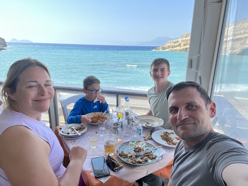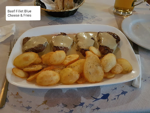 Pleasant friendly staff always, typical taverna setting where the chairs have seen more paint than Dulux.Fantastic view overlooking the bay across to the caves. The best home made Mousaka in Matala by a mile! I ate here several times over the weeks I was here. Look out next season for 'Fillet Steak with Blue Cheese Sauce' it's a must have. Just ask for it. Begged the owners to put it on the menu, absolutely delicious. The best Beef Stifado I found in Matala, thick chunks of tender beef with melt away onion in a rich sauce and believe me I tried several tavernas, the food here is just the best. All complete with a fine cold...