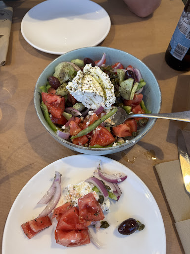 On 3rd trip to Greece, and we have enjoyed a wide range of cuisine throughout. So, we were pleasantly surprised in tasting three shared items that all were quite tasty, and each new to us in a key respect as well. Classic saganaki, but with fig jam -- of course!, how can we ever imagine it otherwise now? The caesarean roll with tomatoes, cheese and bit of meat -- like a large puff pastry with a savory focus. And, the moussaka flutes (like an egg roll). All wonderful, and by divine mystery just the right amount to have ordered! We dined in the lovely indoor setting with prevailing winds (bonus: very calming, relaxing background music), and they have outdoor seating too of course. They also have a very loyal local following, as we saw from the pick-up business and strolling by at other times. If you want a satisfying blend of classic and innovative, we...