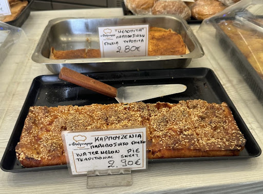 Read moreA place I regret not visiting a second time. Their pies are fantastic, their sweets delicious, and they offer vegan options (spinach pie, leek pie, tomato & olive pie, and various desserts). If I had made it in time, it would have been my number one choice for breakfast on the island. It’s located right next to the bus stop and has outdoor seating, perfect for enjoying your morning meal. They also serve coffee, and the prices are very reasonable. The staff is incredibly friendly and smiling, even under the...