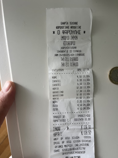 Read more118 EURO… 2 person. We paid this bill for 6 large red mullets, 8 medium sized shrimps, 1 portion of sardines, 1 portion of calamari and 2 beers. The red mullet weighed 542 gr on the scale. I think the shrimps weighed around 400 gr. You can't ask for this bill from a Greek citizen with a name. I think they thought we were rich. The salad was definitely not a size for 2 people, they charged 2 for it. And they made up a price for the breads. If you want to be ripped off and you are a tourist, this is what you will end up with. But if I were a local, I wouldn't go to a business that treats tourists like this. The fish wasn't badly cooked, but it was very salty. The shrimp wasn't bad either. This is too much for a shabby...