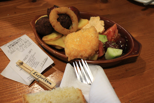 I also had small platter. It had fried meatballs, onion rings, sausage cuts, fries, tomatoes and cucumbers. It was so cheap, I was...