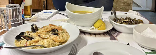 So we turned back into a small alley and went to a restaurant where a young lady had given us a warm smile as we passed by. We ordered seafood rice, fish soup, and Cretan-style snails — all of them were very delicious: The seafood rice was somewhere between Spanish paella and Portuguese rice soup, but what really stood out was the incredible freshness and sweetness of the seafood. The fish soup, likely made with red snapper, came in a boat-shaped bowl with a yellow-green broth and a touch of rice. It had a rich, creamy flavor, with tender fish and even what seemed like crab meat, making the taste and texture wonderfully layered.