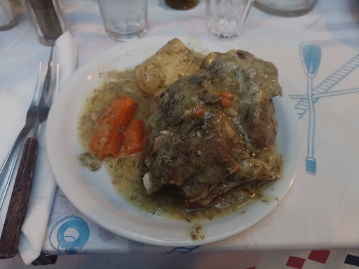 The restaurant offers traditional homecooked Greek dishes. My Greek partner liked all of the things that we tried: lamb stew (in egg sauce; there's potatoes and carrots in it), beef stew (in tomato sauce and wine; fries on the side); taramosalata (fish egg dip in a small saucer with an olive in the middle), horta (steamed radicchio; dark green and bitter; served in olive oil and lemon juice), pastitsio (not pictured; long tube pasta with minced meat and beschamel; oven-cooked; served as a square portion); fried shrimp (served with lemon slices); calamari in rice pilaf (not pictured; brownish).