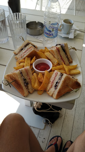 Just our 2nd day in Crete and what a warm welcome. We had a wonderful time here on two beach beds for only € 8. There was drink service all over their beach area. We ordered delicious cocktails and received a complementary plate of fruit and a bowl of nuts. This gave me a royal feeling and a wonderful start to the holiday. The sandwiches were not only dirt cheap, but delicious too they even served some chips with it.