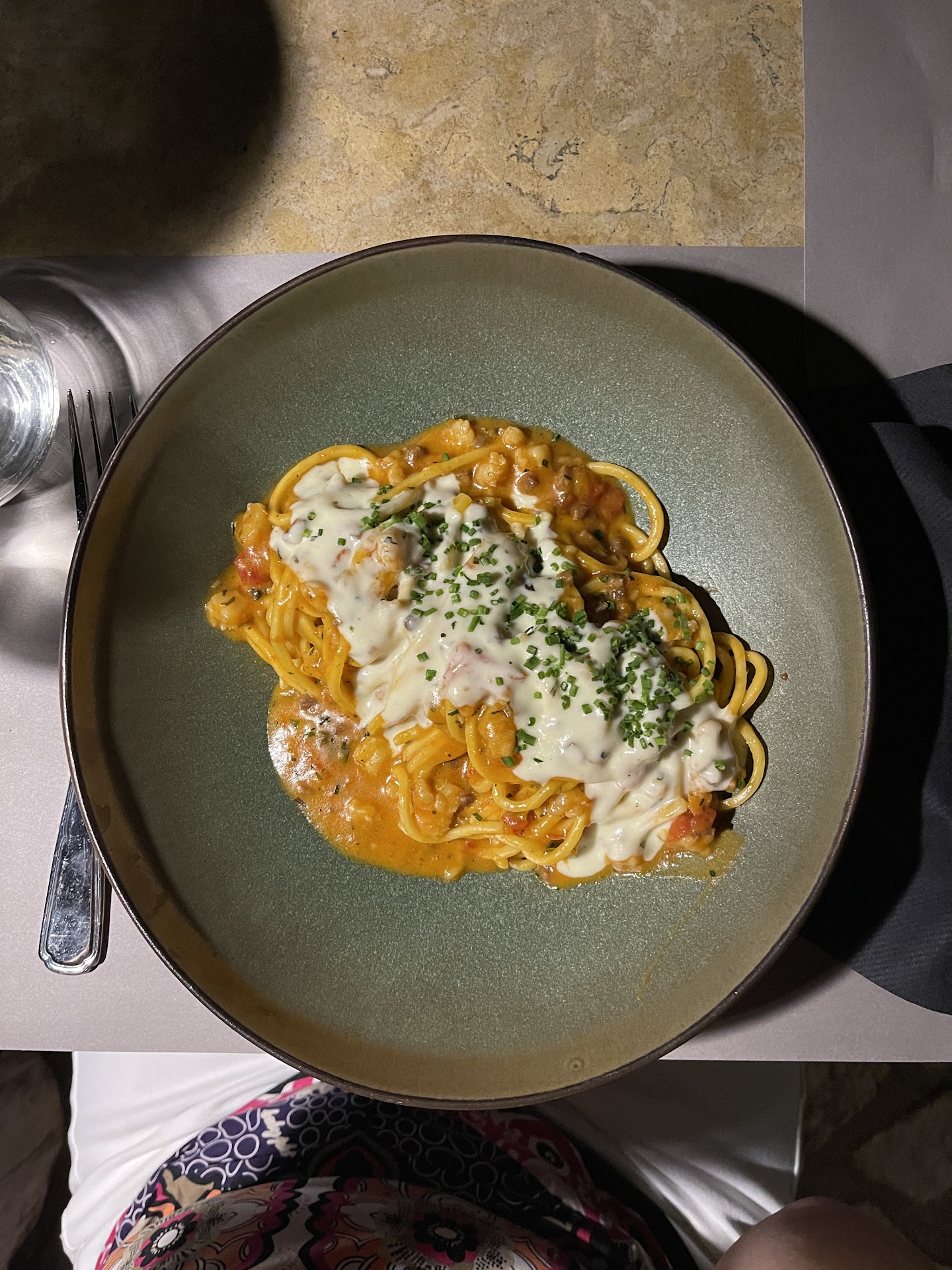 On the positive side, the food itself was tasty. The eggplant, shrimp croquettes, and beef carpaccio were delicious. For mains, I had the crayfish bolognese, which was flavorful but overly salty. My husband’s chickpeas with lamb was good but under-seasoned, while my daughter’s rigatoni with short ribs was very enjoyable, though it lacked Parmesan cheese, which never arrived despite being requested. Dessert, the so-called “tiramisu sphere,” turned out to be more of a white chocolate ball filled with mocha mousse and a biscuit, not really tiramisu.
