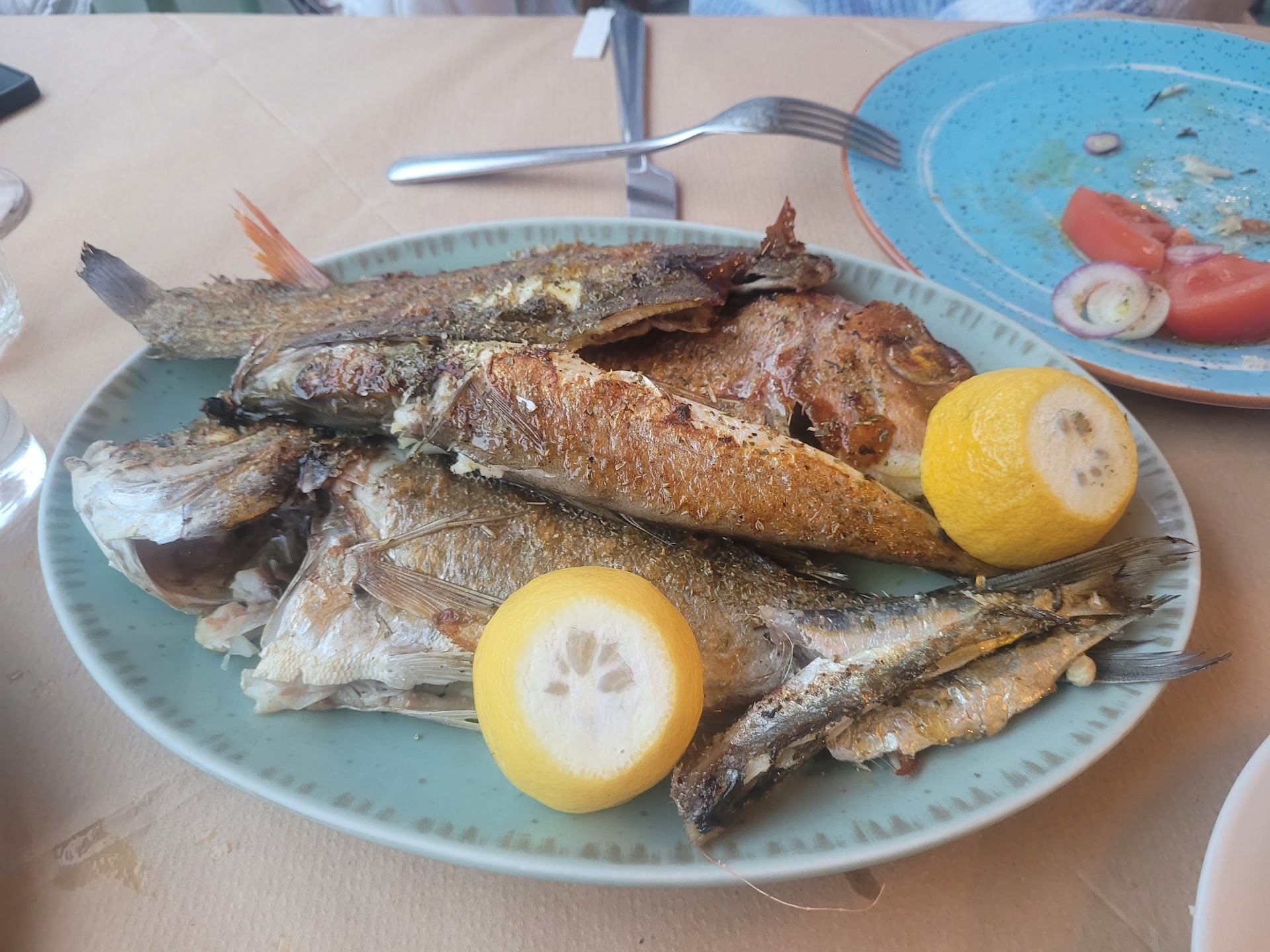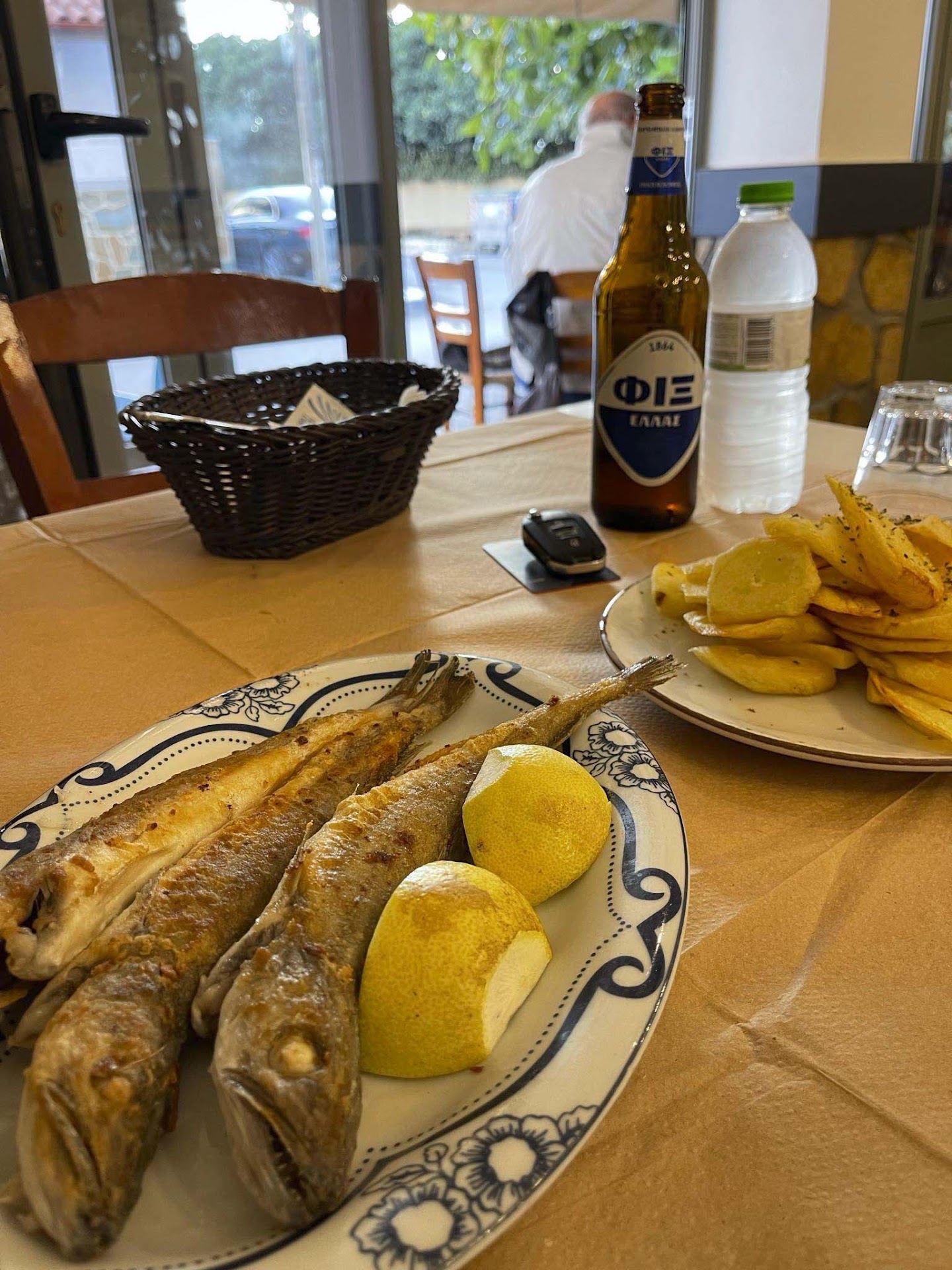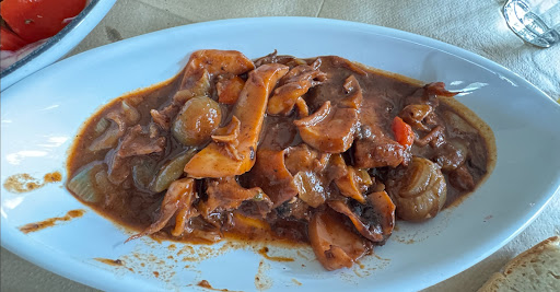 Second, the food was so good. Before we were seated, the waiter kindly briefed us about the fish he had available and asked us if that was ok with us. We ordered a Greek salad, a local dish of squid (kind of stew mixed with vegetables) that was beyond delicious. A grilled red snapper, homemade French fries. It was wrapped with a complementary watermelon. The prices are very good vs the quality of food and freshness of ingredients they offer. Definitely coming back here before we...