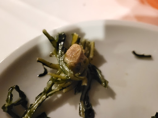 Complete disappointment, can't understand the rating being above 3.5 stars. The octopus has a decent enough taste but someone should inform Dunlop and Michelin - vulcanised rubber has found it's master, they should start making Nok-topus tires. Its consistency was worse than that of any octopus dish I've ever experienced, which includes me trying to grill it myself. And believe me when I tell you that wasn't great either... Still. The greens were like your ex, cold and bitter. However, I'm almost impressed how a veggie dish can be oily AND watery at the same time. Some, any, just the tiniest hint of seasoning outside a bath of olive oil might be an idea for improvement. Sardines are really hard to screw up. Those were decent; very, very small though. Can't complain about a gift but good god what even is this dessert besides inducing type 2. It was brought after we explicitly said we don't want anything else after what we were exposed to before.