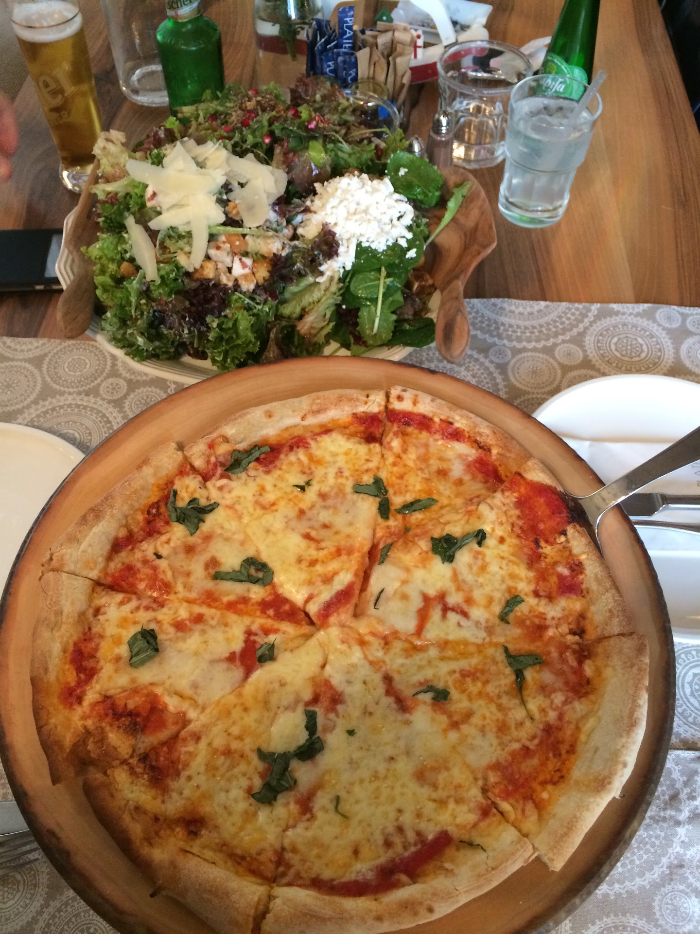 I was looking for a place to have good ice cream in Kalamata. Surprisingly enough, I was not able to find one place that would be either open in the evening or offer good ice cream. Very disappointing to realize, that such a big city doesn’t offer ice cream. By pure luck I asked the waitress serving outside if they have good ice cream. Selection was not big, but when she said, they have good pistachios ice cream, I had to try it. I had nice waffles with two scoops of ice cream. Pistachio and caramel. The topping was the best ever salted caramel. Waffles were not fresh. It was too hard and not made fresh. Which spoiled the whole experience. Overall, I wanted good ice cream which I really enjoyed. We also tried pizza. It was amazing! Excellent dough, nicely cooked, crispy and good quality prosciutto and mozzarella. The ambiance of the place is with Central European vibe. Reasonably priced. Very welcoming, warm and nicely decorated. Personnel was polite...