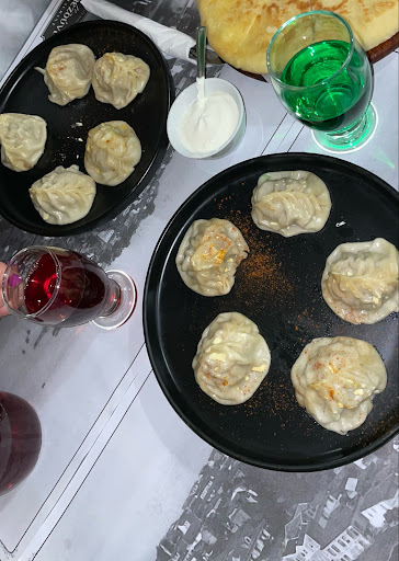 We ordered boiled beetroot with tzatziki and pita bread as starters. For a side, I had roasted potatoes, and my main dish was fried sea bream. My wife chose pelmeni, a traditional Russian dumpling dish.