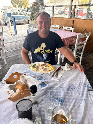 Read moreOn the harbour road with protection for the weather in mid April. We wanted fried aubergine to start but only courgette was available, it was fine with tsaziki. For mains I ordered grilled squid but it arrived fried, the batter was light however. The chicken souvlaki was fine. Complimentary bananas in honey concluded our meal With a litre of house red the bill came to...