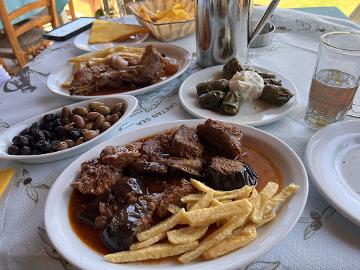 My husband and I got the beef with aubergines, rabbit stew (rabbit stifago), olives and stuffed vine leaves. All the items were excellent. We are an American couple who wanted to come and taste authentic Greek food- it was great! Service was not friendly but they were still attentive, just had frownie faces on all the time. 🤷🏻♀️ Dessert was a very moist and sweet orange cake with watermelon with the aperitif.