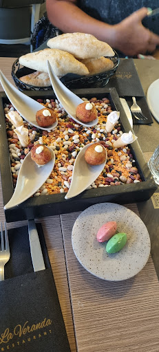 Read moreWe kwamen hier dineren met 2. We namen de linguini met zeevruchten en de lamskroon op Franse wijze. Ze drongen aan om ook het brood te nemen. Want daar krijg je de apetizers bij: een gefritureerde bol met aubergine en iets anijsachtigs, een mini scone met een mousse in en 2 botertjes: eentje met basilicum en de andere met pesto van zongedroogde tomaatjes. Hier wordt nadien wel 5 euro voor aangerekend. In de linguine zaten scampi's, mosselen en een rivierkreeftje in. Het lam, dat 14 uur slow-cooked zou zijn, was aan de zijde van het bot nog heel rauw. De rest was wel lekker. We namen er 1/2 liter witte wijn, 1/2 liter rode wijn en een grote fles water bij en betaalden 64,5 euro. Beide (droge) huiswijnen waren de beste die we dronken in Karpathos. Al bij al een gedeelde 3e plaats op de 20 restaurants die we deden...