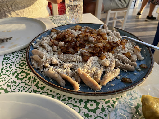 Le lumache di Karpathos si salvavano, ma non abbiamo potuto apprezzarle appieno: siamo stati costretti a interrompere l’assaggio per correre ai Makarounes, già tiepidi al momento dell’arrivo. E il piatto, per quanto tipico, si è rivelato deludente: eccessivamente unto in una versione, asciutto nell’altra, e dominato da una pesante copertura di cipolle caramellate e formaggio che stancava dopo pochi bocconi.