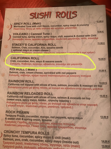 They brought us the California roll and written in the menu was that the ingredients are: crab, cucumber, avo, MAYO and sesame seeds. (see attached photos), a safe option for me and my intolerance. Our roll had cream cheese instead of Mayo.