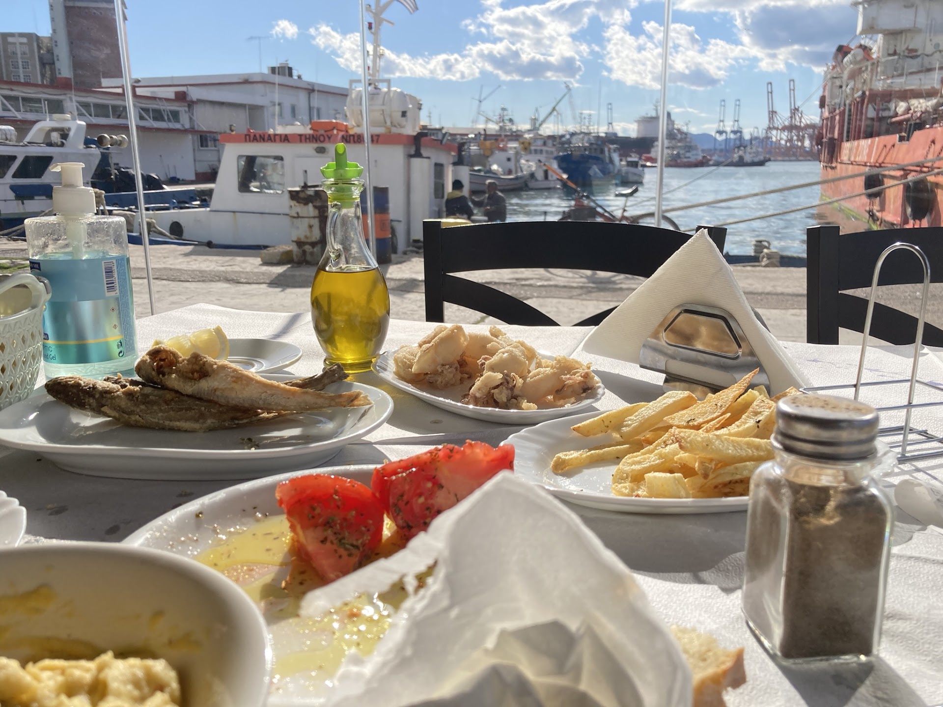 the worst place to visit if you re in a hurry and you value manners, the staff are extremely uncaring for everything, orders get lost and during rush hours you may never get served. Near 7 pm we were told there was no credit card service even though we were informed to the contrary one hour ago. We ordered boiled shrimps and fried fish in 3:30 pm and we got served in 6:00 pm. This happened not in a large restaurant but in a caravan of 8 tables. The toilet is a chemical toilet for construction facilities and not a regular one. Still its like a rare glimpse to the dark side of humanity near an industrial port. The decadent industrial environment contrasts with the sun and sea. The sea breeze is wonderful and coupled with large quantities of ouzo and patience may let you forgive (though not forget) the establishment for their...