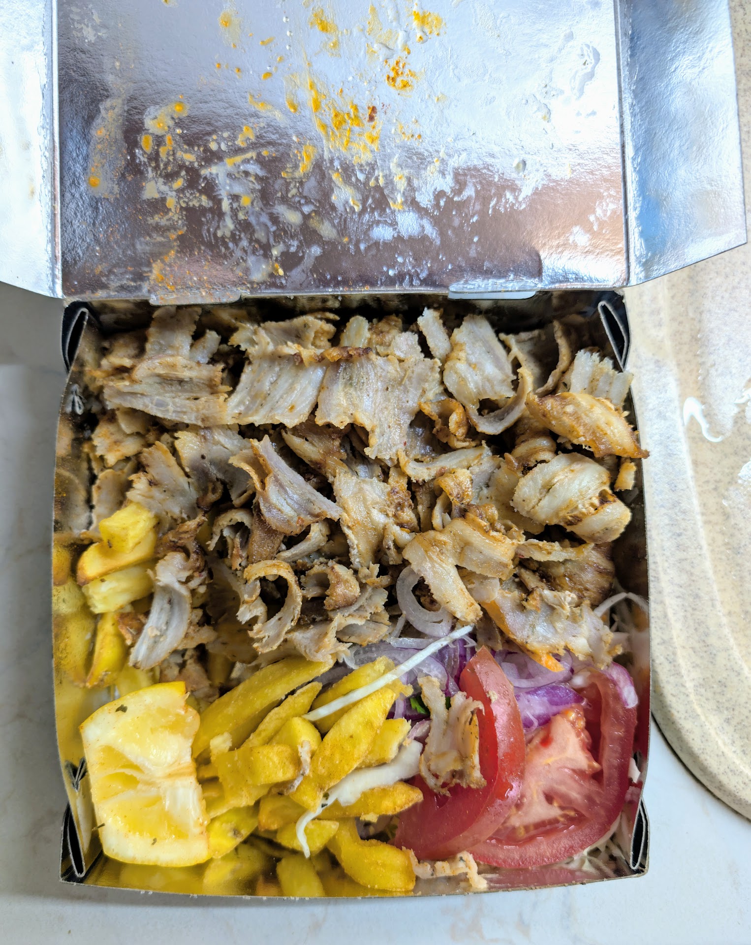 Read moreΈχουμε παραγγείλει αρκετές φορές, ωστόσο πρώτη φορά πήραμε γύρο χοιρινό σε μερίδα... Μαζί πήραμε και γύρο κοτόπουλο μερίδα όπου ήταν αρκετά καλή. Το θέμα ήταν στον γύρο χοιρινό ο οποίος ήταν μέσα στο λίπος, ok γύρος είναι, γνωρίζουμε, αλλά όχι το 95% της μερίδας λίπος! Κατά άλλα οι πατάτες και στις 2 μερίδες σχεδόν άψητες και άνοστες όπως και οι ντοματούλες... η σως ήταν καλή όπως και οι πίτες. Τους πήρα τηλέφωνο για να τους ενημερώσω και φυσικά δεν αποδέχτηκαν τίποτα...και είπαν πως είναι λογικό να έχει λίπος ο γύρος χοιρινό! Αφήνω την φωτογραφία της εν λόγω μερίδας, εδώ και τα συμπεράσματα στο κόσμο. Βάζω 3 αστεράκια για το σύνολο, 1 για την απάντηση τους και τον τρόπο που απάντησαν και 1 για τον...