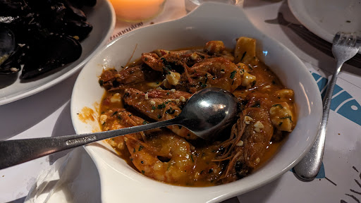 The friendliest/kindest waiter (and I think restaurant owner) we had over the last 6 days of our trip. The restaurant is nicely located by the main cute little square. The tables outside are poorly lit so you might prefer being inside that is very open anyway. The prawns came in a rich tomato sauce. Nice but possibly a bit overpowering the taste of prawns. The mussels were served in a lemony and white wine sauce. Tasty too but, although I liked it as is, our friends would have preferred with less lemon. The 250g of red mullet came as three little fishes so indeed they have very small bones and makes it a bit harder to clean. They were grilled, simple is most often the best way with fishes, but a side dish would have been nice. We were offered Easter melon for dessert; a very...