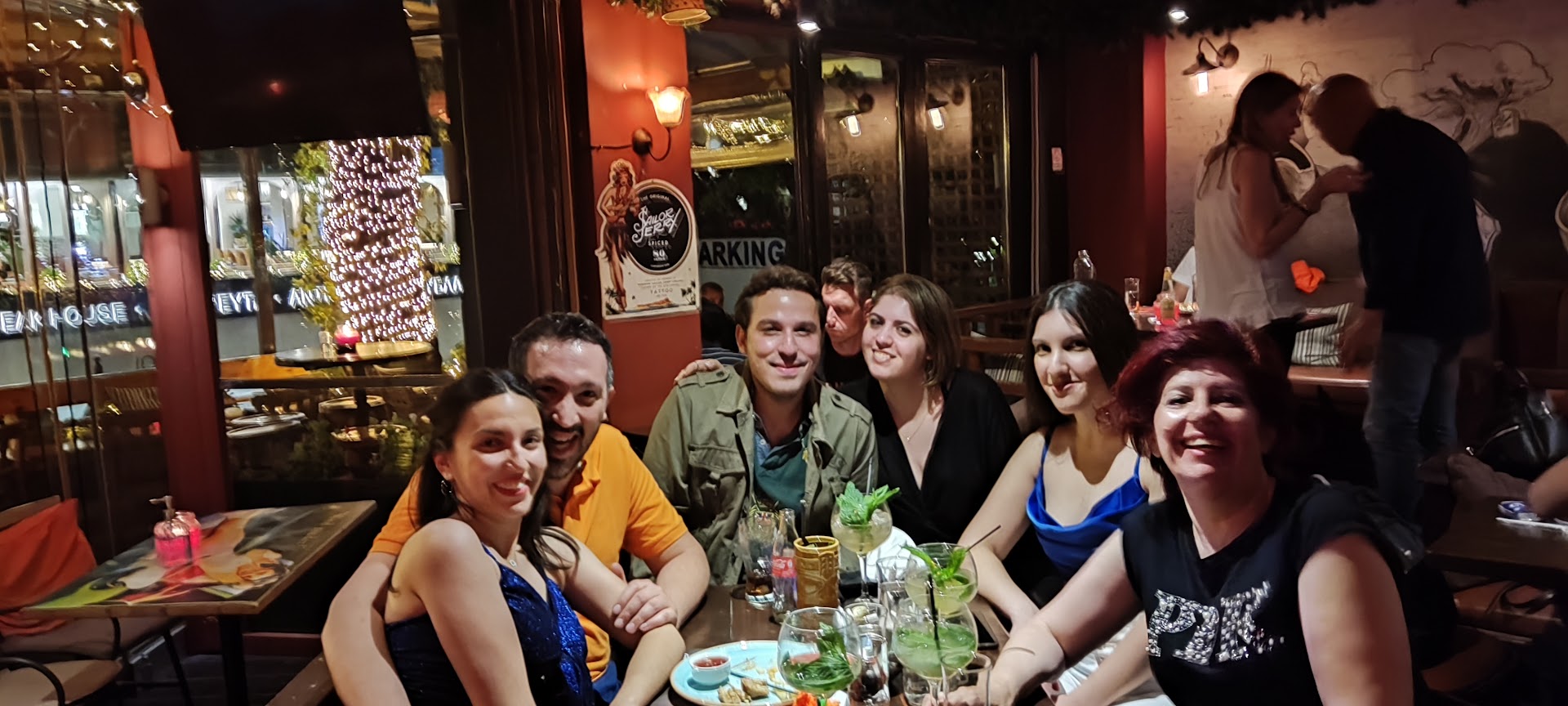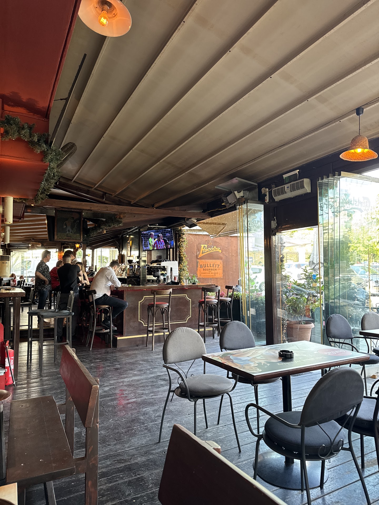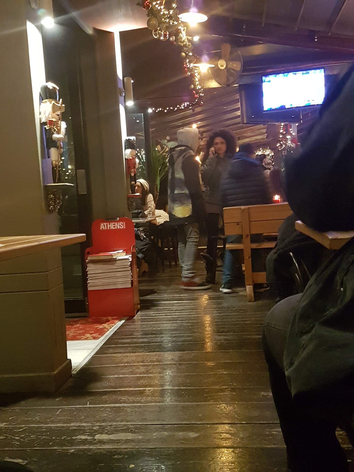 We went there to watch a football match that it was of interest to us and not for the majority of the Greek clients. We made a booking, but as we were almost an hour late our table was given away. However they managed to squeeze us in an alternative place at some distance from the nearest TV, but still acceptable. The atmosphere was vibrant and lively. It is, I would say an atmosphere that reminds an English pub, a Continental Cafe and a bistro. There are quite a few, not the very big ones, TV monitors. The service, considering the busyness of the place, was good, fast and efficient. The beer and the other drinks were really cold. I was really pleased because they serve my favourite beer, draft extra cold Guinness! I noticed that they were serving hot food late in the evening which would be very...