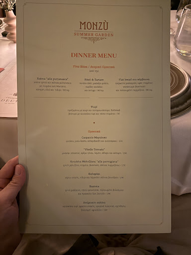 On the outskirts of Kifissia is Monzu, an Italian restaurant housed in a building dating back to the early 20th century. The restaurant has a lovely garden. Unfortunately, there is a terrace near the interior where the tables are for smokers, but without separating the rooms, resulting in all the cigarette smoke entering the non-smoking area. From the dishes, we chose the Agnolotti pasta with topinambur, aged parmesan, Szechuan pepper, bottarga, and lime. It had a very special taste worth trying. From the pizzas, we chose the Mortadella-Pistachio with mozzarella, burrata, pistachio pesto, aged parmesan, and Bologna mortadella. The pasta was excellent, and overall, all the ingredients tied together perfectly. Finally, from the main courses, we chose the Shi Drum with zucchini cream, burnt lemon, green beans, and grilled seasonal greens. This dish scores an excellent 10/10, and you must try it. For dessert, we tried the “Cappuccino” with hazelnut praline crispy base, coffee cremeux, mocha ice cream, and mascarpone mousse, which was an excellent and refreshing choice to finish off a beautiful dinner. The staff...
