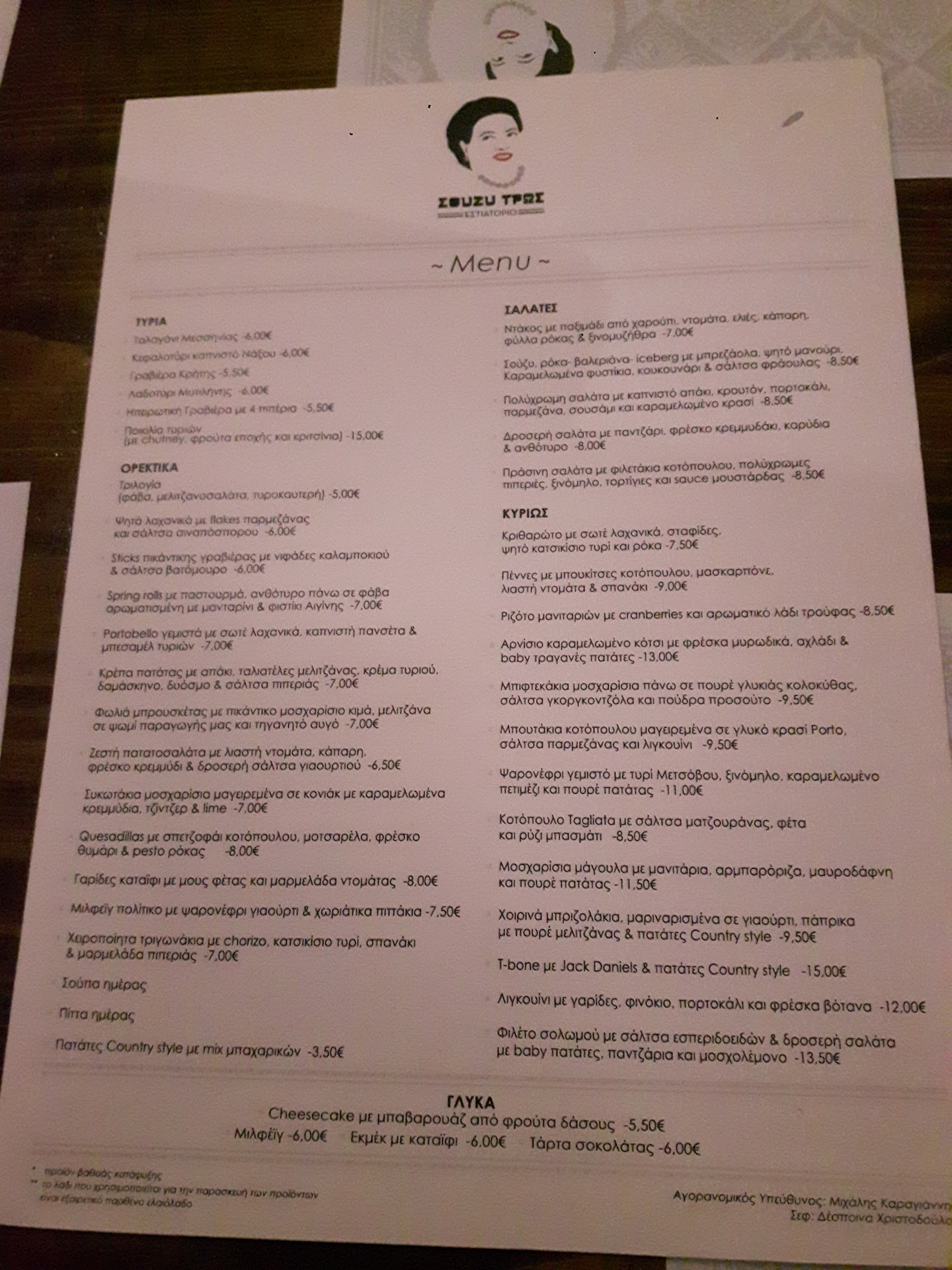 Σαν μαγαζί δεν ήταν άσχημο. Το ντεκόρ του εννοώ... Λουλουδια ... κουβάδες του χωριού...ραπτομηχανες... περικοκλαδες ... τα χαρτιά στη τουαλέτα κρέμονται από σχοινί... Δεν ήταν κακό αν και περίμενα να ξεπροβάλει από κάπου ο ταρζαν ή ο Βογλης με γαλότσες.. Ο σερβιτόρος εξυπηρετικοτατος κι ευγενικός. Χαρούμενος και πρόθυμος. Μας έφερε τον κατάλογο...ο οποίος.. μια κόλα Α4 , με 5 επιλογές ανά κατηγορία. Πουθενά τοματοσαλατα, μόνο ντακο , πουθενά τα παραδοσιακά ορεκτικά της ελληνικής κουζίνας. Τα κυρίως πιάτα ως επι το πλείστον, ζυμαρικά... με κρέας ή γαρίδες.. Παραγγελνουμε.. τις γαρίδες, ένα φιλέτο ψαρονεφρι με πουρε , πέννες με κοτόπουλο και Μπέργκερ. Και μια σαλάτα Σουζη .