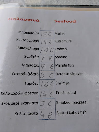 The hard-working, lone waitress is helpful, patient, and very eager to please. She speaks English well, so she can offer advice. I went there out of season, but I can imagine that when the restaurant gets busy, having only one waitress slows down the service. The decor is cheap. The menu is in both Greek and English, but it would help to have photos of the dishes. The prices are expensive, considering what's on offer, the small size of the portions, and the seating. The restaurant entertains loud patrons at night, and staying across the street from them induces...