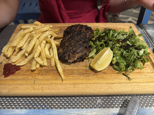 Once we had placed our order, the aperitifs were served first, allowing us to enjoy the start of the meal at a leisurely pace. The Greek salad and pita with tzatziki were of excellent quality, raising our expectations for the main courses. Unfortunately, these didn’t quite meet those expectations. I had ordered a medium-rare beef steak, and my partner opted for a burger. The fries that came with my partner’s dish were soggy, cold, and overly salty. Additionally, we had expected a traditional burger with a bun, rather than just the meat, though we realize we perhaps should have asked. The meat was also overcooked, almost burnt. My dish was flavorful, but the meat contained a lot of fat, which detracted from the overall experience. I also expected a bit more fries served with my dish.