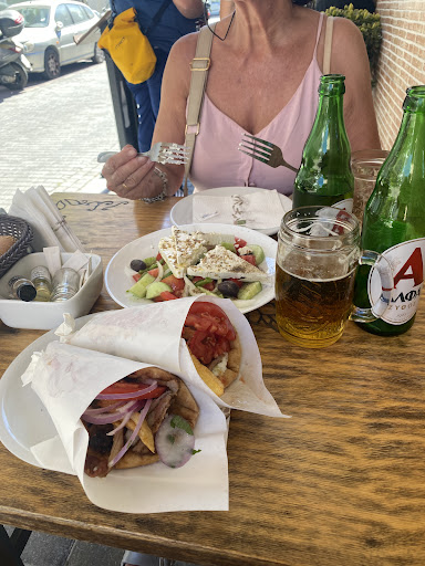 Read moreAs a first thing, the owner went on the other side of the street cleaning some garbage. Not that this was his duty but he could not see how people left their litter behind just like this. So....a person who cares about his clean environment. Thumbs up! Next: my wife and I wanted to order 2 portions of mixed Gyros at 8,50 Euro each plus a greek salad. The owner "warned" us that the plates (for one at 8,50) were quite large and we should rather order more if we still felt hungry after eating the first portion instead of ordering 2 and returning most of it. What a good advice. We could allost jot finish it....the one portion. We had 3 small Mythos and an Ouzo and the said salad and mixed Gyros at 25 Euro in total. And the Gyros was really delicious. Crispy and quite a lot. I clearly recommend the place. (And it did not get boring either as you could watch for the whole time what happened in the tattoo studio right across the...