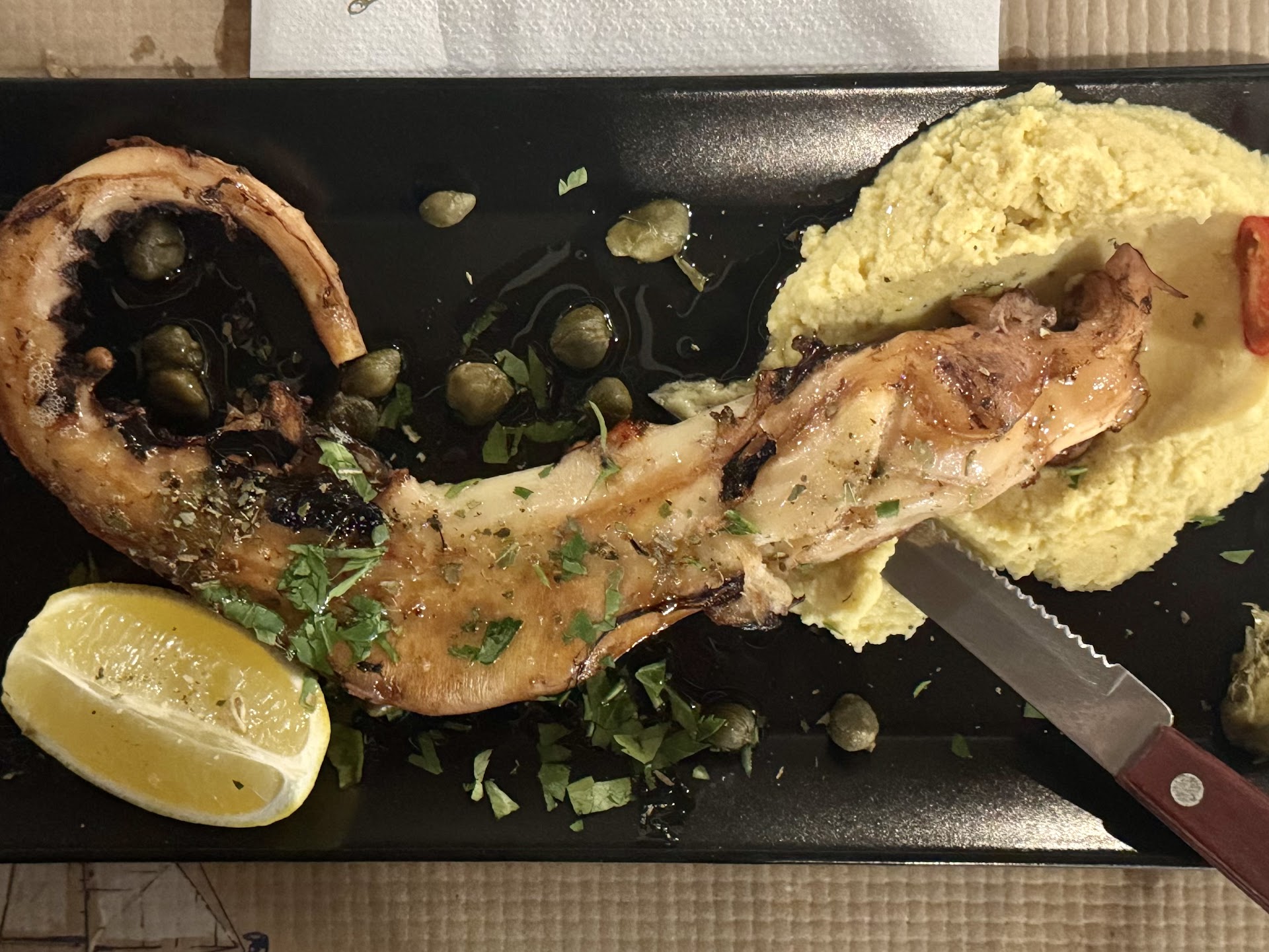 Taverna Limionas — it’s love at first sunset. The sun slowly sinks into the Aegean Sea, you’re sitting at a table somewhere on top of the world, and in front of you — the perfect dinner. We had octopus, calamari, and a tuna steak — and honestly, it was wow. The tuna? Juicy, perfectly grilled, not even slightly overcooked. That’s rare. But the octopus… oh my god. That was the best octopus I’ve ever had. Not rubbery, not chewy — just tender, silky, and full of flavor. Absolute perfection.