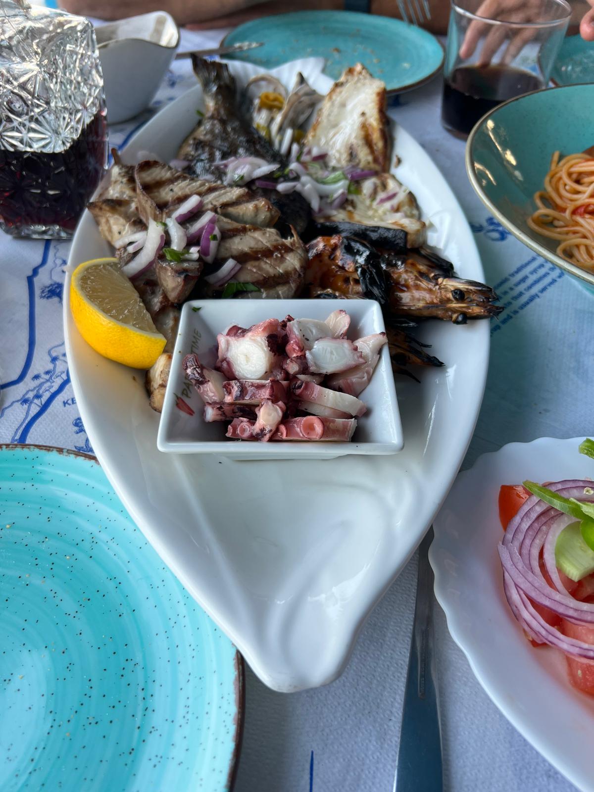 I ordered the mixed fish platter and absolutely loved it. I believe they serve different ingredients each day, but everything was excellent. The pasta was also very good, with portions that were generous and satisfying. The tarama was delicious, and the wine service was equally pleasant.