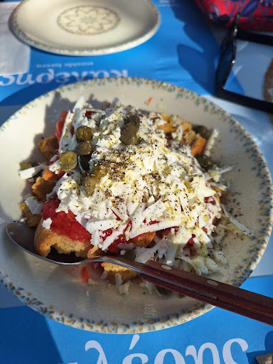 After many visits in 2023, the food is of a consistently high quality and delicious in summer 2023. Kaleris is serving the best fava (yellow split pea puree) on the island. I keep forgetting to take a photo as we dive in. The traditional salad/παραδοσιακή is a firm favourite, with grilled manouri cheese, also the little spinach pies, the saganaki, with or without sausages, and if the chef's mother's courgette pie is on the menu as one of the daily extras, don't miss it. A good place for vegetarians!