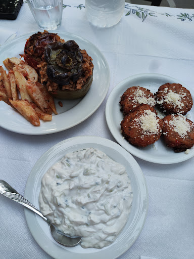 Delicious small restaurant in the middle of what I have to call roundabout - which isn't really a bad thing, as you can observe the lovely village interactions. We visited early in the evening, and as the time was passing, place became more and more full, clearly a locals favourite. We got tomato croquettes as a starter, with home bread and tzatziki, followed by soutzoukakia, baked goat with caramelized onions, and got a bonus meal we didn't order, but didn't know how to explain owner it's not what we wanted - after all, everything we tried was so good, that we gladly kept it. I am not biggest goat fan, but the preparation was spot on, meat was falling off the bone, caramelized onion sauce was delicious. Soutzoukakia was absolutely fantastic, and so was everything else. Fully recommend, really cute local place with great food and...