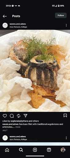 Read moreI don’t generally like to give bad reviews, but after dining at a similar “finer” restaurant in Avlemonas, I felt it would be unfair not to share my honest experience at Waves and Wines (especially for those seaking a more elevated dinning experience in Kythera). The wine list is quite limited and doesn’t really reflect the restaurant’s name. Overall, the place tries to project a “finer” dining style with small portions and elevated presentation, but the execution falls short. For example, the pork tomahawk was large, but it came with only four baby potatoes on the side. The mango salad was completely overpowered by an overly sweet and chilly mango sauce, making it heavy rather than refreshing. The ceviche wasn’t really ceviche, but more like a tartare with small fish pieces. Finally, the tagliata was on the small side, served cold, and accompanied by just a few mushrooms (described as seasonal, but they were simply pleurotus). In general, I appreciate the effort to offer a “better” menu option in Kythera, but unfortunately the concept is not...