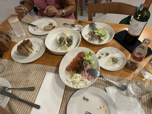 Read moreThe food here is miles ahead of other restaurants on the island. Best food and bread we had on Leros (my favorite dish was the raw fish with fig and cilantro). Having said that, we didn’t think the dessert with white chocolate and “crumble” with nectarine and ice cream was good - that one needs work, though the presentation was lovely. I would also recommend they ask customers if they want anything else after the main course instead of just bringing the check. We assumed there was no dessert or coffee because we were given the check without being offered anything else. Lastly, they have a problem with bees and we spent at least 45 minutes with 6+ bees circling us and our food (eventually they burned coffee next to our table, which helped, but that was overwhelming smell wise while eating). All the tables around us had the same problem. Would recommend looking into whether the beehive can be safely moved elsewhere by an expert. The service was excellent, wine list great, and I appreciated how clean the...