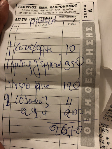 The restaurant is located at the main road down to the town (very practical) and located on the first floor. The restaurant has parking spaces behind the restaurant and the view from the first floor (where the restaurant is located) is very good - we have been there in the evening hours. We were greeted by George himself who seemed to be a nice and funny guy and was (besides another service guy in sweatpants) taking the orders and bringing food. Besides a good first impression by the owner, the food (most important) was unfortunately a total disappointment, we had some starters (Saganaki cheese, Bread and dip - not ordered, but still invoiced and garlic pies) that tasted OK but looked very boring. As a main dish my gf had seafood pasta with overcooked shrimps from the freezer and an unidentifiable tomato sauce and I had Gyros and “Souvlaki George”. The gyros was tasting like pig (disgusting - still ate it as I was hungry) and it was clearly the worst I had on Crete (I tried many). The quality of the Souvlaki meat was not good either and I had to return half of it as it was stringy. The sides on the plate were as boring as the restaurants decoration and overcooked. As a dessert (for free, typical in Crete) we got some fruit which was not eatable as it was pickled with a somewhat parfumery flavor. The paying took an eternity (even as the restaurant was mostly empty) and we had the feeling of being willingly ignored. We gave no tip as the experience was a real disappointment. During our visit we had to kill several insects to eat in peace as they obviously feel very much at home in the tree structure of the restaurant. I can ABSOLUTELY NOT understand the...