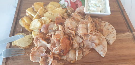 I chose the Chicken Gyros, which arrived deconstructed on a large platter. It looked appetising and consisted of a large portion of sliced chicken, fried potato slices, small mixed salad garnish, pitta bread & a bowl of tzatziki. The food was well prepared and tasted lovely. The proportions of each item were perfect to compliment one another. Following the main meal, I was provided with a complimentary fruit platter (melon & apple), together with a small carafe of raki.