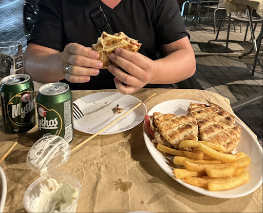 The food was delicious - we ordered pork gyros, chicken souvlaki, and a Greek salad with a soft drink. All for under €20! There were some cute cats running around too, giving us some...