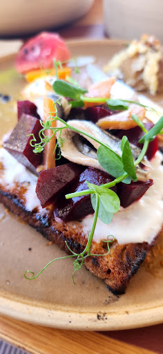 We visited at lunchtime and enjoyed the clever watermelon salad, fresh produce of intense flavours. The magnificent sand cooked potatoes; a rye bruschetta of beets, pickled white anchovies, strained yoghurt and bottarga; grilled octopus with paprika paste. Thoroughly delicious and food coma inducing.