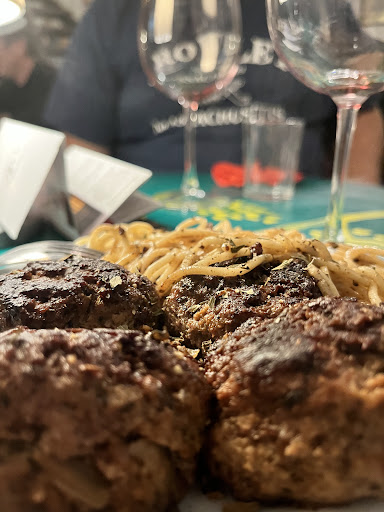 🍝 You MUST order the meatballs (€9 and worth every penny). Homemade fresh to order, oregano heavy, and paired with a slightly sweet spaghetti. Together, they are heavenly and unlike anything else I’ve eaten in Greece.