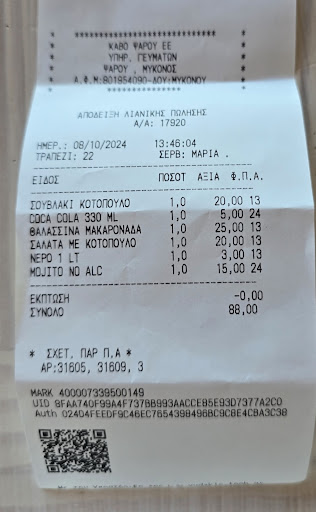 Read moreOne of the worse in Mykonos. Service very bad, but the worse thing is that they charge you 15% service without telling you and without putting it into receipt. If the bills is 90 euros they make you pay 110. When we asked why she didn't tell us in advance she said: well you know you need to pay service! Seriously? Ridiculous people. You need to ask for service Lady, what you did is called stealing! Food was below average, salad wasn't even cut properly...tomato and cucumber tasteless, which is strange for Mykonos, so must mean is the lowest...