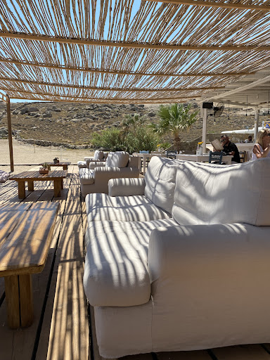 This was a great find. I am Greek and not easily swayed by touristy stuff but have broadly traveled and honestly think this place salvaged our weekend. Here is what we loved: Approach to this part of the island is very beautiful. Think golden wheatfield, not overbuilt, serene. Quiet and chill. Loungy not clubby. The antidote to boots and pants kitch in other pants of island. Lovely small beach. Green crystal waters. Sand but with small gravel in beach. No sandblasting. Sand will not go everywhere. Be aware that if you have small kids water deepens pretty quick. But just adorable naturalistic landscape. The restaurant club house does not violate this vibe but blends in well. We loved the serene styling of the place. Shade and cool to escape to and have a meal or coffee/drink. The baths are something! Open air, gorgeous, Great architecture. With showers (warm) too. Good parking. Food and drinks. Very good. Expensive for what it is, but quite edible. Good melitzanosalata, huge salads. Nice calamari. Choose carefully as some dishes are def overpriced. Some advice to the management; price up the costly items (eg steak, fish) not coke or the cheap stuff. Psychological factor: anyone will pay for quality but pricing up regular items will sour customers - hence other reviews. Happy to pay a premium overall to enjoy a day in a tasteful environment with people that don't offend. Day beds on beach way too expensive (90 euro for two, most expensive on island). No other shade on beach. We felt this was way too punishing. We sat on sofas and it was fine as we don't like roasting anyway. Pic says how nice sheltered area was.