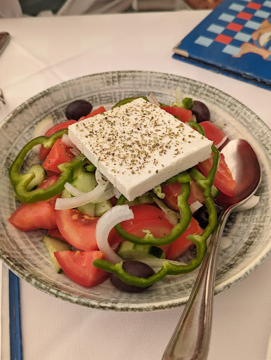 We ordered a Greek salad, the Assorted Seafood (€25) and the Lobster with pasta (€30). The bread was delicious. Very soft and fresh, a good start to the meal. The Greek salad was fresh and yummy. Lots of fresh chunks of tomato, some cucumber, onion and bell pepper with a block of seasoned feta on top. Very classic. The Assorted Seafood was squid, sardines and prawns served with fries and a side of tartar sauce. Is ok but the menu said "fish" and we got sardines so technically ok but not what I expected (my fault for not asking). All of the seafood was fried (similar to fried calamari) and served in a fry basket lined with paper (also unexpected for the price) but unfortunately all of the fish was overcooked and rubbery. The lobster was served on a plate on the side of a bed of spaghetti with red sauce. The lobster was also unfortunately way overcooked. Some of the meat was so stuck it would not come out of the shell. The pasta tasted similar to store bought box spaghetti and the red sauce lacked seasoning and flavor.