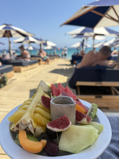 We were on the Virgin Voyages Greek Island Glow cruise. During our stay in Mykonos, we visited Super Paradise for a beach club experience. Paraj is a hotel within Super Paradise offering a beautiful alfresco mediterranean dining experience within steps of sandy beaches and the Agean Sea. The restaurant strives to create fresh fish and seafood dishes that match the majestic sea views of their beach club.