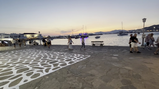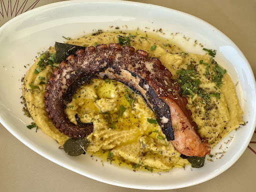This restaurant is located right next to the water in Mykonos town and offers a delicious menu of Greek/Mediterranean food catered to a typical western palette. The grilled octopus was fresh, perfectly cooked, and served with a very good fava bean paste. I then had the shrimp kritharoto with mussels that was a Greek take on a mixed seafood pasta, a type of pasta I’m particularly fond of and one I wanted to try in a Greek style. This was a greatly appetizing dish without being too filling, and the creaminess of the sauce was pleasant with the various seafood flavors. All of it had been perfectly cooked as well and served very fresh. I also had a glass of white wine recommended by the server that didn’t pair the best with the food, but that might have been due to a lack of better options served by the glass. The bottle list has better variety overall, naturally. I ended with the “baklava” dessert that was both sweet and savory, having a mix of cold creaminess from ice cream and a nice granola-like crunch as well. They also have a full espresso bar that made a good espresso. Overall, this was a delicious experience, I didn’t feel rushed to leave or order, and the views are hard to beat. Had it not been such a windy day this would have been perfect, but that’s no fault of their own. I highly recommend those visiting Mykonos to stop by here for a more upscale and well-received...